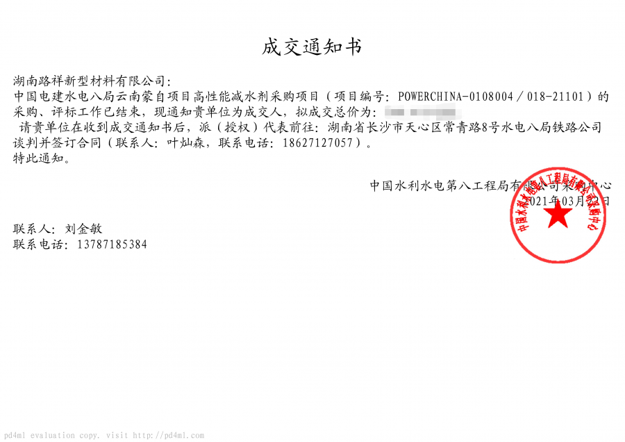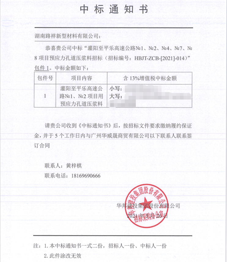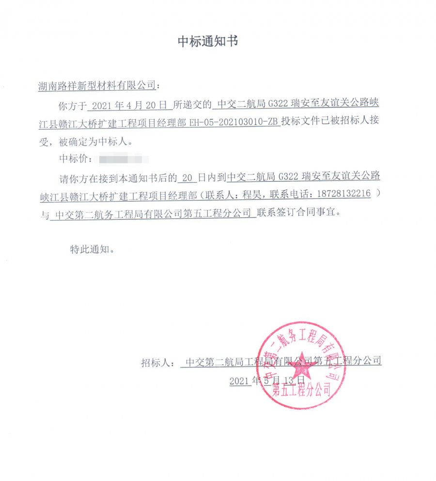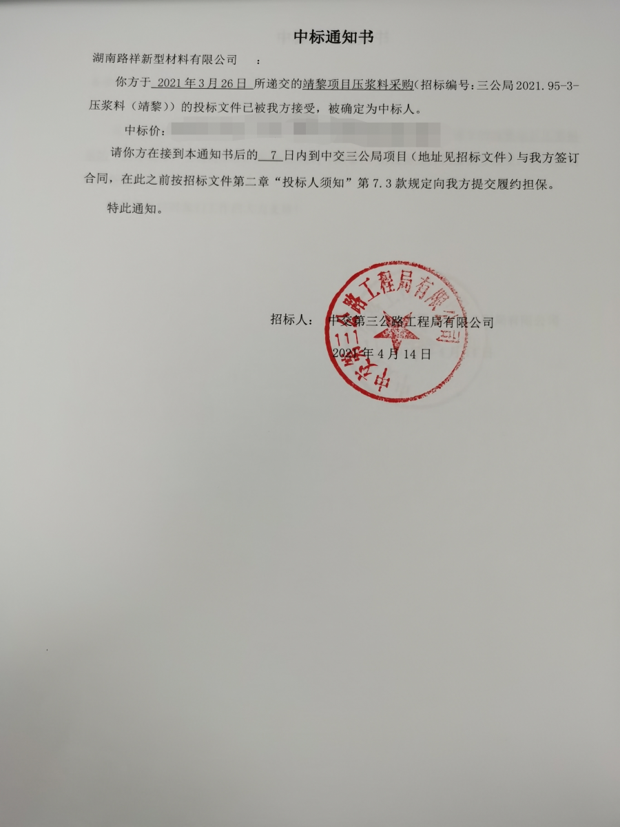 | 湖南路祥中標(biāo)通訊: 近日,公司接連收到好消息: 1、公司遞交的中交三公局巴田項(xiàng)目壓漿料采購?fù)稑?biāo)文件已被招標(biāo)人接受,被確定為中標(biāo)人。 2、中國交建二航局贛江大橋項(xiàng)目投標(biāo)文件被確定為中標(biāo)人。 3、中國電建水電八局云南蒙自項(xiàng)目減水劑采購?fù)稑?biāo)文件被確定為中標(biāo)人。 4、中交三公局靖黎項(xiàng)目壓漿料采購?fù)稑?biāo)文件被確定為中標(biāo)人。 5、中交三公局寧韶項(xiàng)目壓漿料采購?fù)稑?biāo)文件被確定為中標(biāo)人。 6、華邦建投集團(tuán)股份有限公司灌陽至平樂高速公路壓漿料投標(biāo)文件被確定為中標(biāo)人。? 湖南路祥將始終堅(jiān)持“以質(zhì)量求發(fā)展、以誠信求生存”的經(jīng)營理念,為廣大客戶提供一流的產(chǎn)品,完善的售后服務(wù), 愿與各界朋友攜手并進(jìn)、精誠合作、同謀共贏。 ![]() ![]() ![]() ![]() ![]() ![]() 中標(biāo)通知書原文: ![]() ![]() ![]() ![]() ![]() 更多湖南路祥中標(biāo)展示(請(qǐng)查看此鏈接):https://mp.weixin.qq.com/s?__biz=MzA5NTQyNzk4Mw==&mid=2247483743&idx=1&sn=0073de88318d4839529879ad72a84bc3&chksm=90becdbfa7c944a9c7e54da7f09b4ab6db3b88c656728c00d08858caa7103623aec8cdef1cc1&token=1106113315&lang=zh_CN#rd |