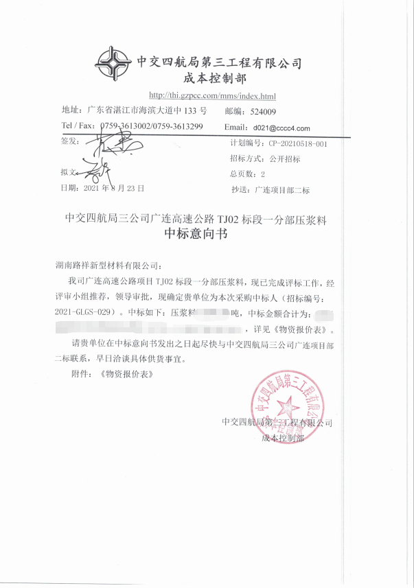 | 湖南路祥最新中標通訊: 8月,我公司在競標中,憑借過硬的產品質量,扎實高效的工作作風,卓越的運作團隊和良好的企業信譽,以絕對優勢順利中標: 1、公司遞交的廣州公路工程集團有限公司南沙至中山高速公路TJ07合同段壓漿劑、壓漿料采購投標文件已被招標人接受,被確 定為中標人。該項目是我司單業績達到千萬以上合同額合同,進一步鞏固了路祥在華南市場的優勢地位。 2、中交四航局三公司廣連高速公路TJ02標段一分部壓漿料采購投標文件被確定為中標人。 3、中鐵廣州局南玉鐵路壓漿料、灌漿料采購投標文件被確定為中標人。 ![]() ![]() ![]() ![]() 湖南路祥將始終堅持“以質量求發展、以誠信求生存”的經營理念,為廣大客戶提供一流的產品,完善的售后服務,愿與各界朋友攜手并進、精誠合作、同謀共贏。 更多中標展示(請點擊鏈接查看):https://mp.weixin.qq.com/s?__biz=MzA5NTQyNzk4Mw==&mid=2247483743&idx=1&sn=0073de88318d4839529879ad72a84bc3&chksm=90becdbfa7c944a9c7e54da7f09b4ab6db3b88c656728c00d08858caa7103623aec8cdef1cc1&token=1106113315&lang=zh_CN#rd |