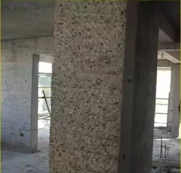 二、麻面 (1)同“蜂窩”原因; (2)模板清理不凈,或拆模過早,模板粘連; (3)脫模劑涂刷不勻或漏刷; (4)木模未澆水濕潤,混凝土表面脫水,起粉; (5)澆注時間過長,模板上掛灰過多不及時清理,造成面層不密實; (6)振搗時間不充分,氣泡未排除。 1、防治措施 ①模板要清理干凈,澆筑混凝土前木模板要充分濕潤,鋼模板要均勻涂刷隔離劑; ②堵嚴板縫,澆筑中隨時處理好漏漿; ③振搗應充分密實。 2、處理方法 ①表面做粉刷的可不處理; ②表面不做粉刷的,應在麻面部位充分濕潤后用水泥砂漿抹平壓光。