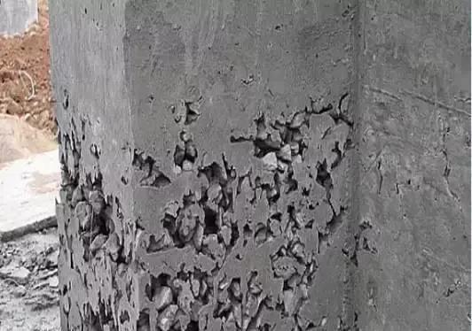五、爛根 (1)模板根部縫隙堵塞不嚴,漏漿; (2)澆注前未下混凝土配合比和成份相同的無石子砂漿; (3)混凝土和易性差,水灰比過大,石子沉底; (4)澆筑高度過高,混凝土集中一處下料,混凝土離析或石子趕堆; (5)振搗不實; (6)模內清理不凈、濕潤不好。